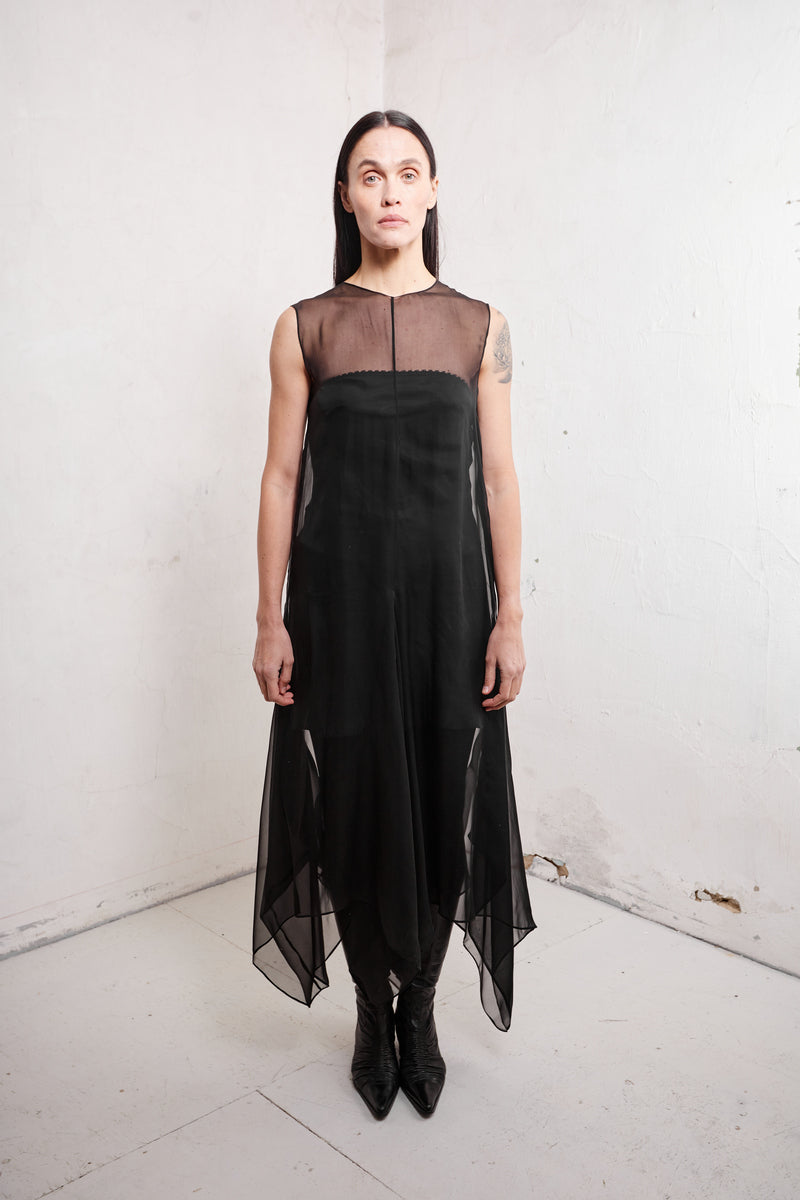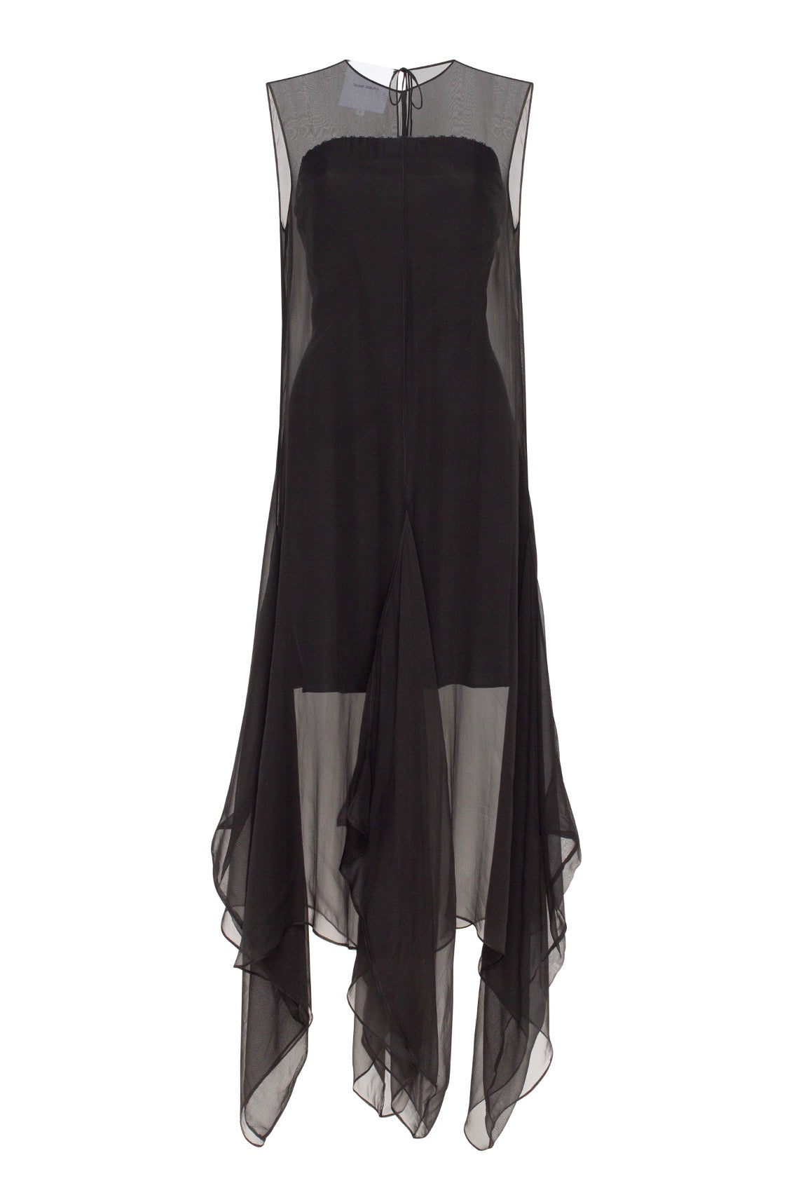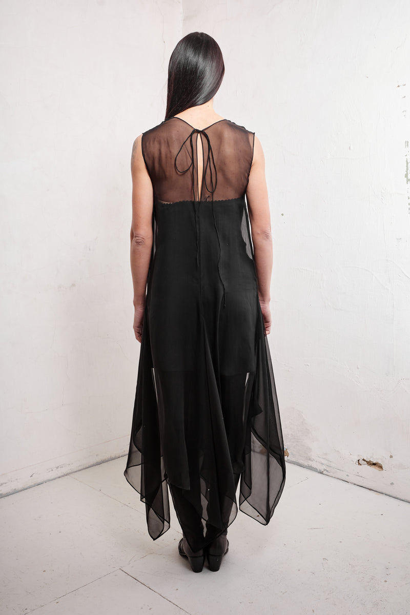 A luxurious maxi silk chiffon dress with a fluid asymmetric bottom, layered over a sleek lining column dress. The ethereal chiffon overlay adds movement and elegance, while the column lining offers a refined, structured silhouette.