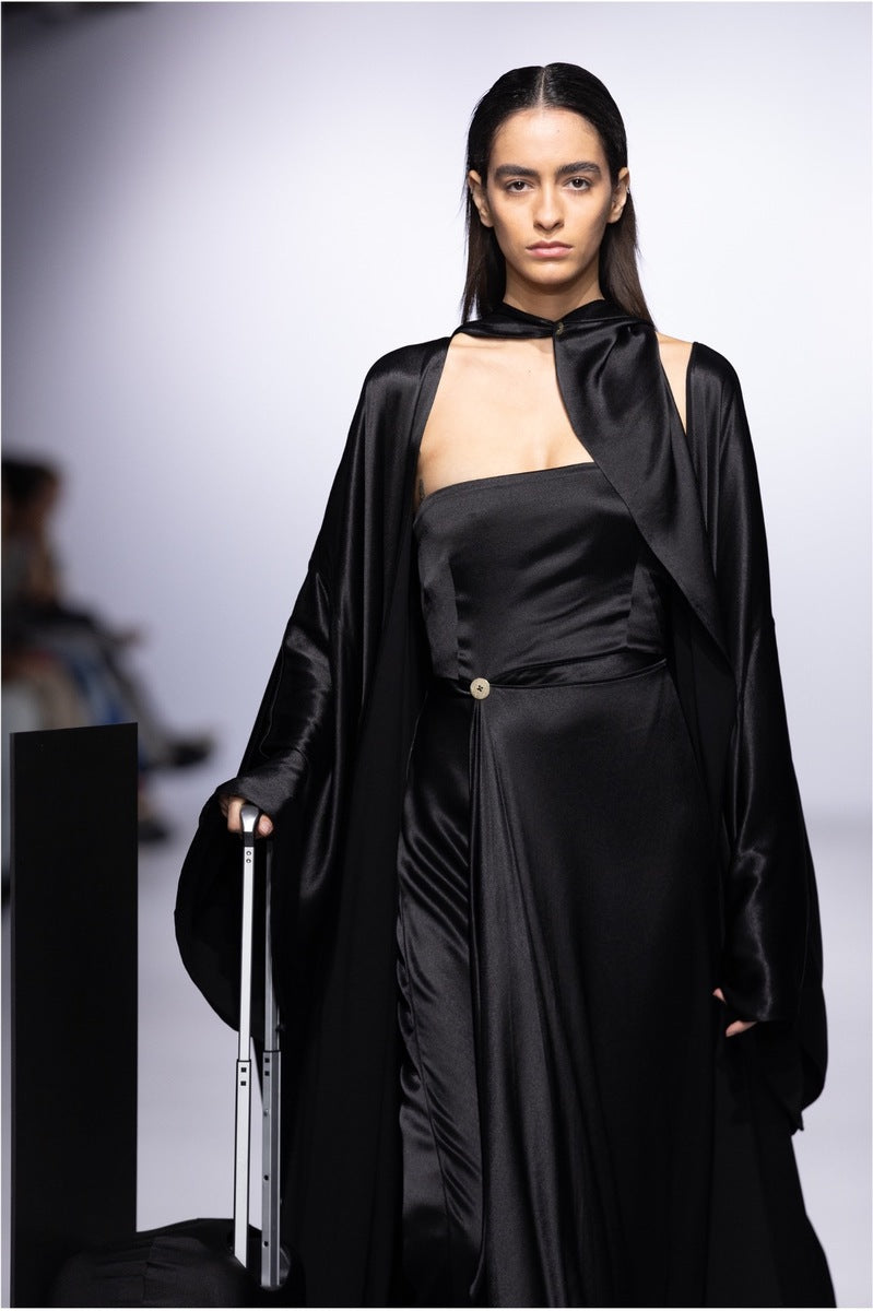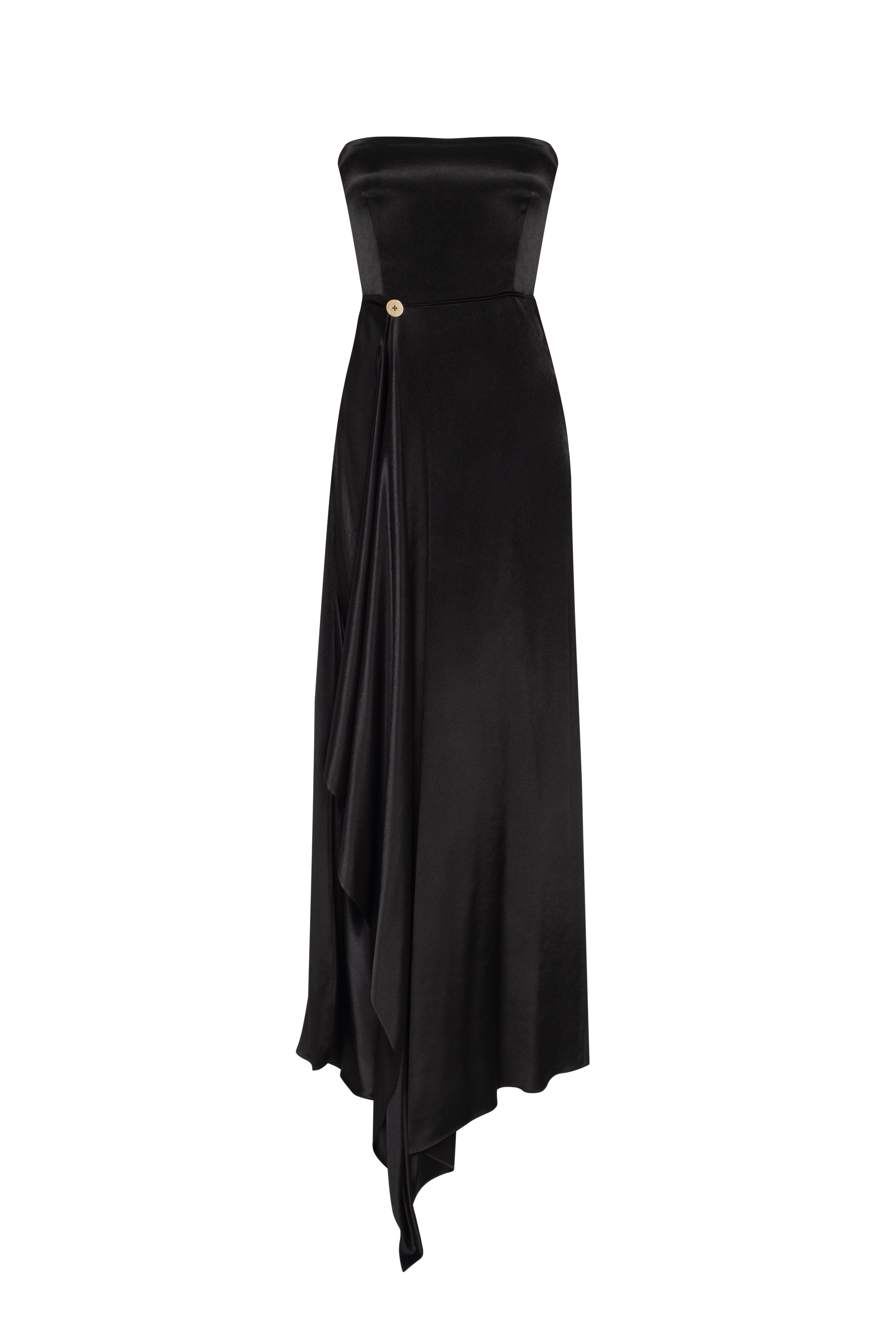 A stunning maxi dress with a structured boned bodice, featuring an overwrap asymmetric front line for a bold, modern silhouette. This design exudes elegance and confidence, perfect for making a statement at any event.