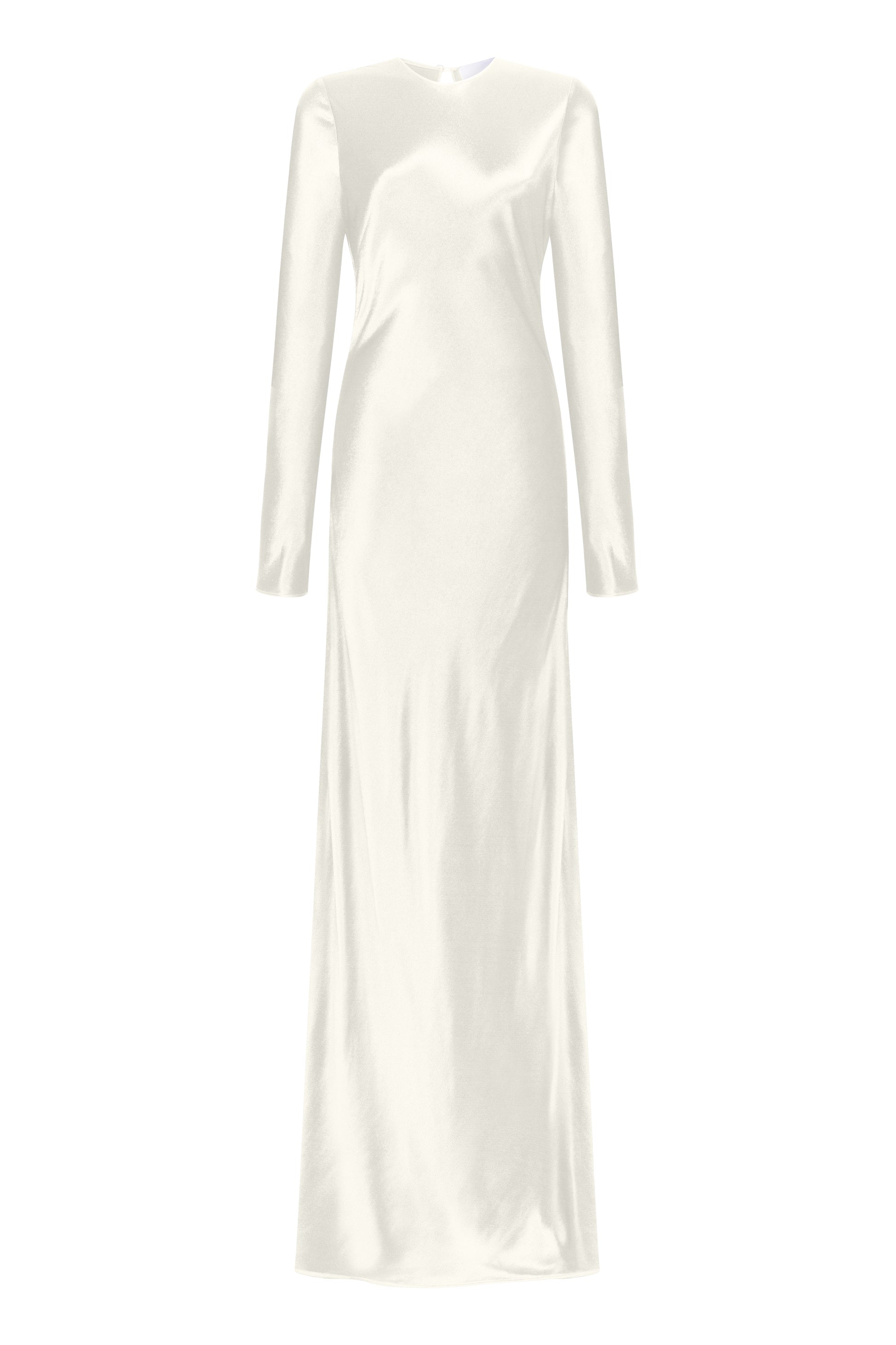 A refined maxi H-line dress with long sleeves, offering a sleek and minimalist silhouette. Its clean lines and timeless design make it a versatile choice for elegant, understated style.