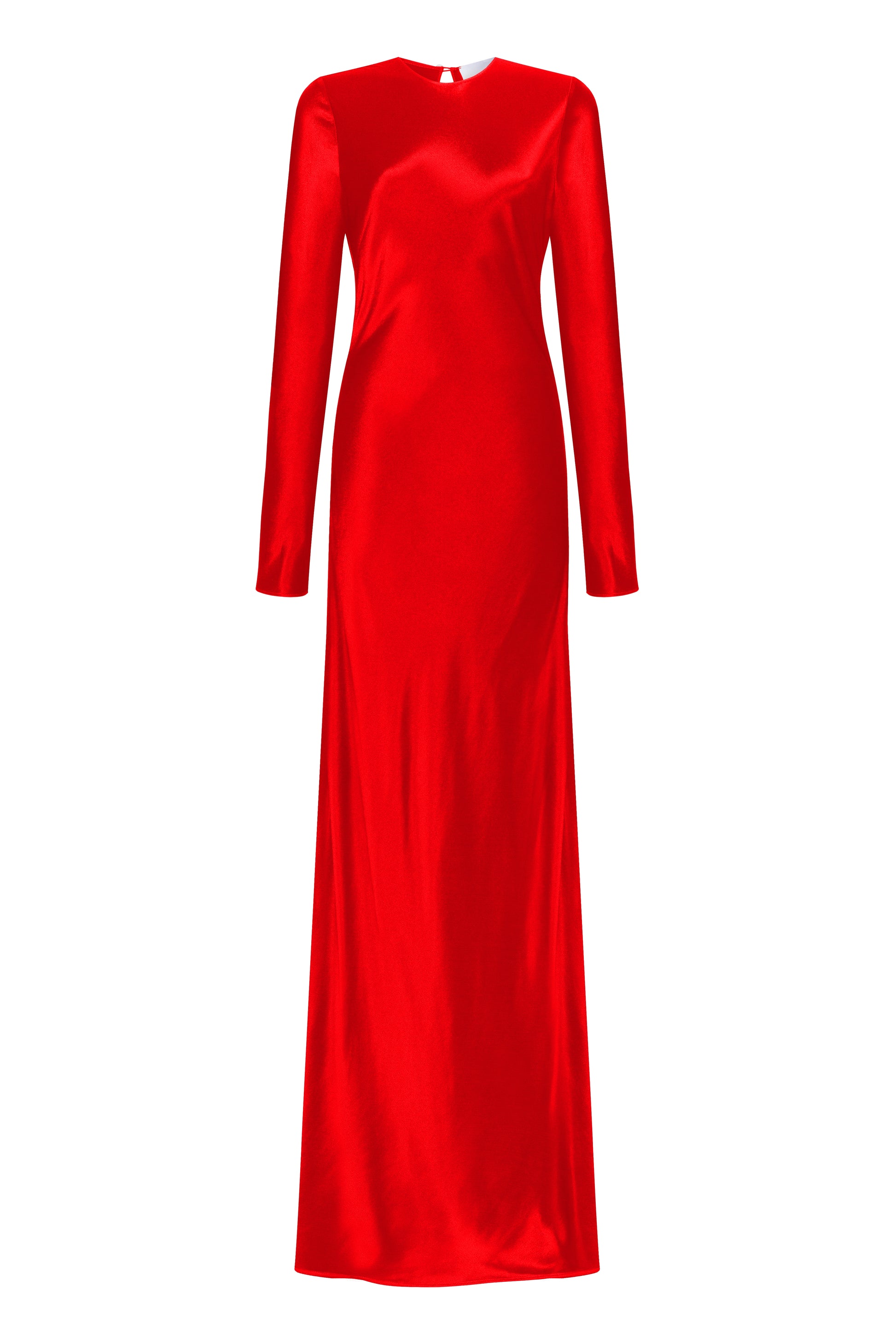A refined maxi H-line dress with long sleeves, offering a sleek and minimalist silhouette. Its clean lines and timeless design make it a versatile choice for elegant, understated style.