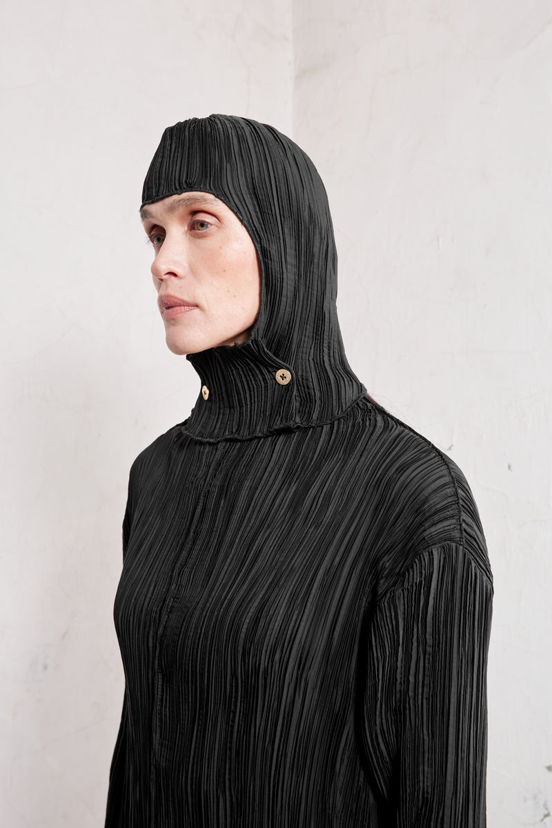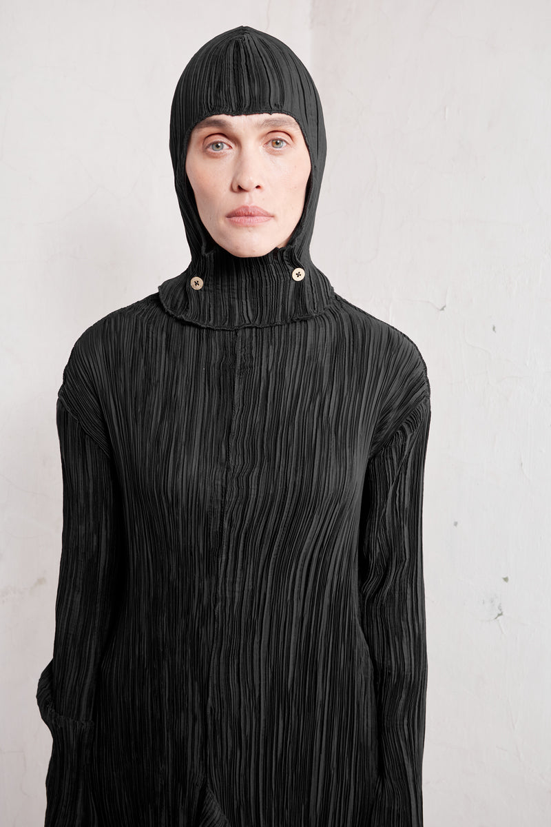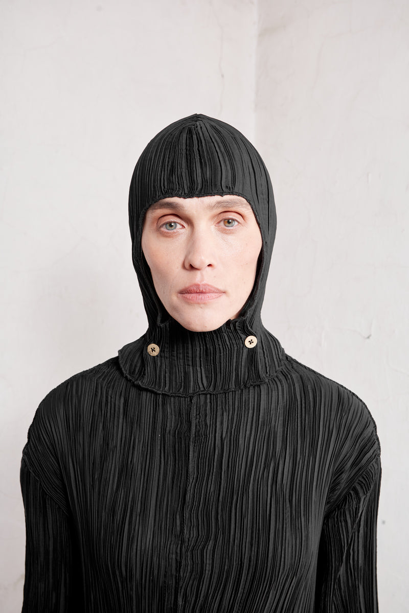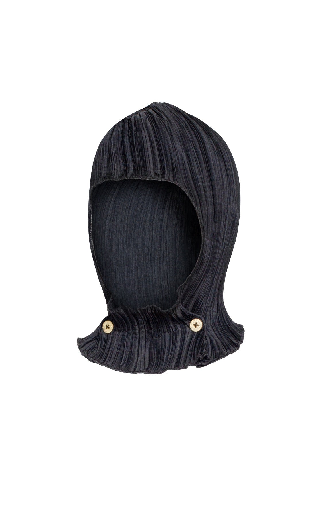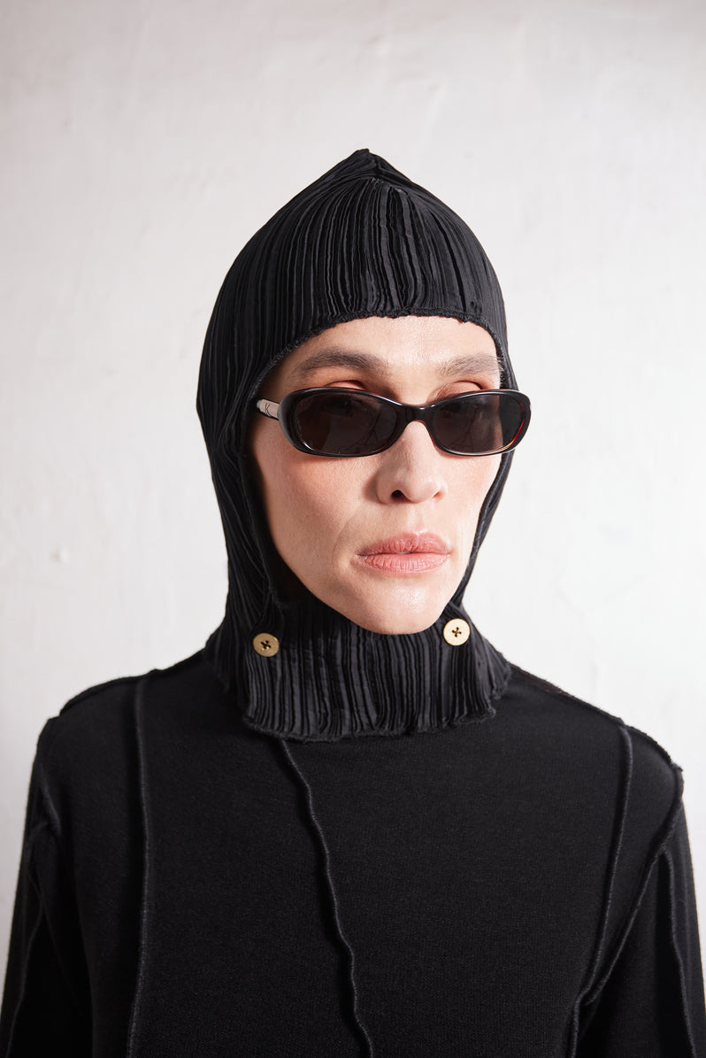 Make a bold statement with this pleated balaclava, combining function and fashion. Its intricate pleating adds texture and a distinctive look, making it an eye-catching accessory for colder days or a daring fashion-forward ensemble.