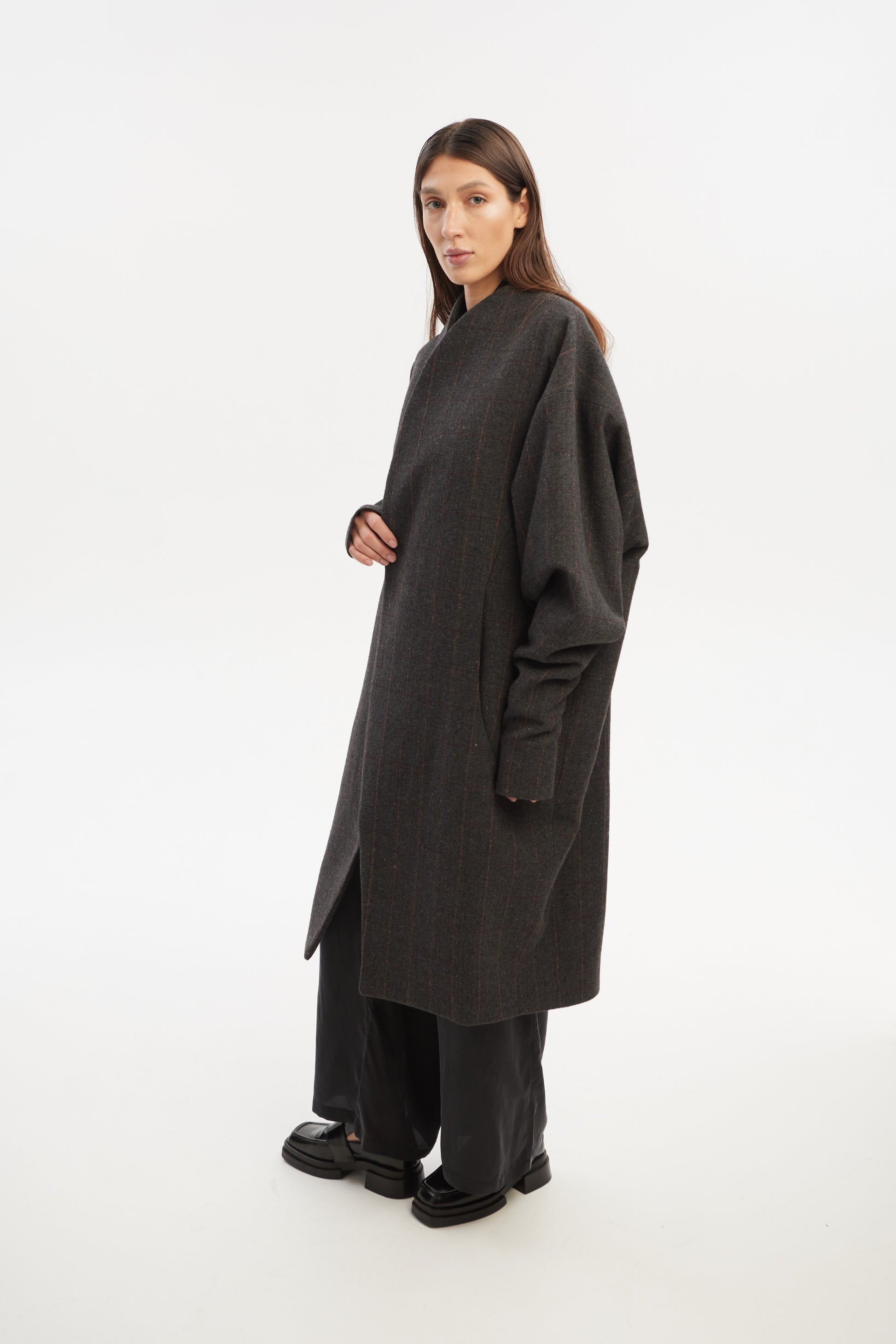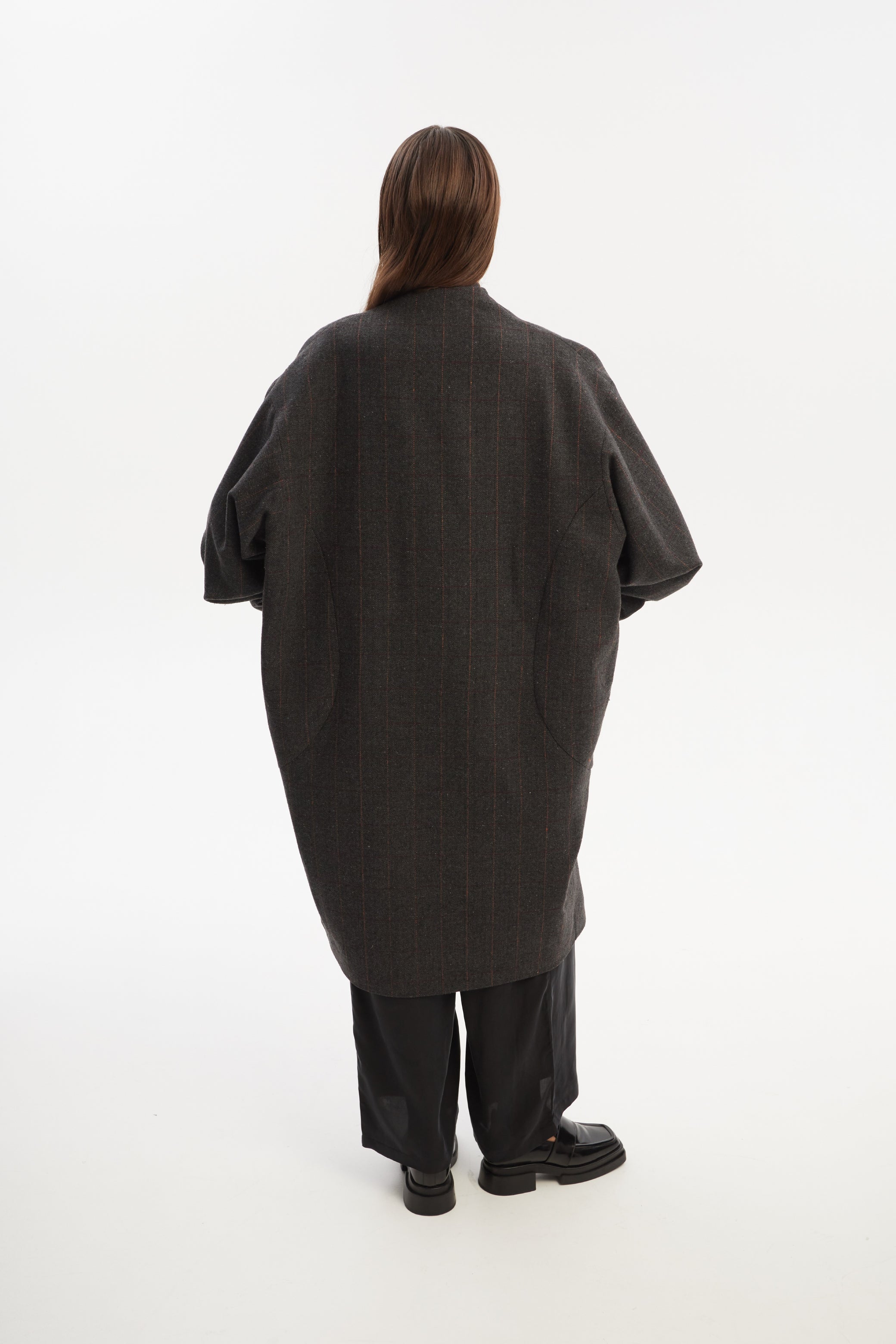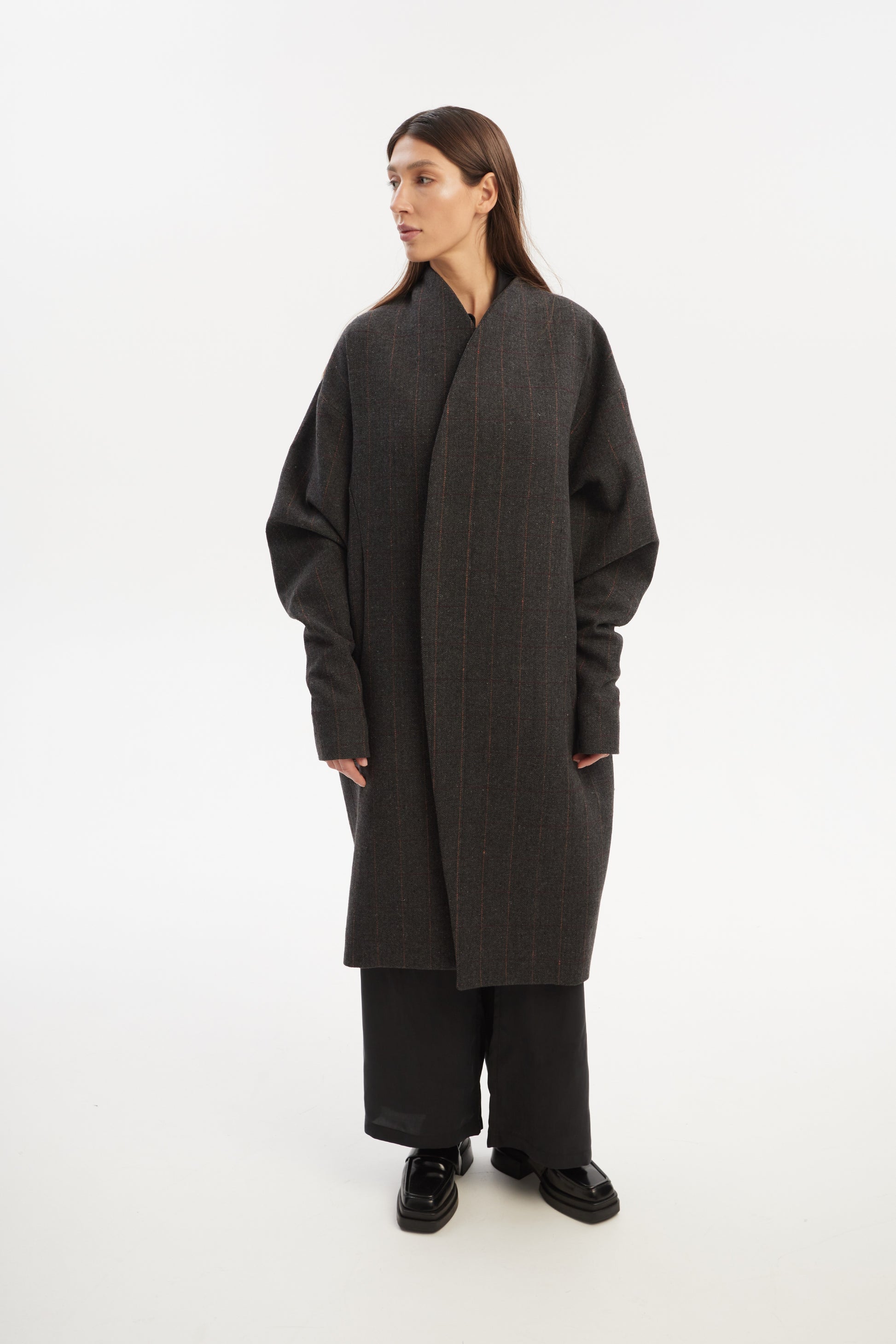 Signature Cocoon Wrap Coat with long tapered sleeves and zips on the wrists.