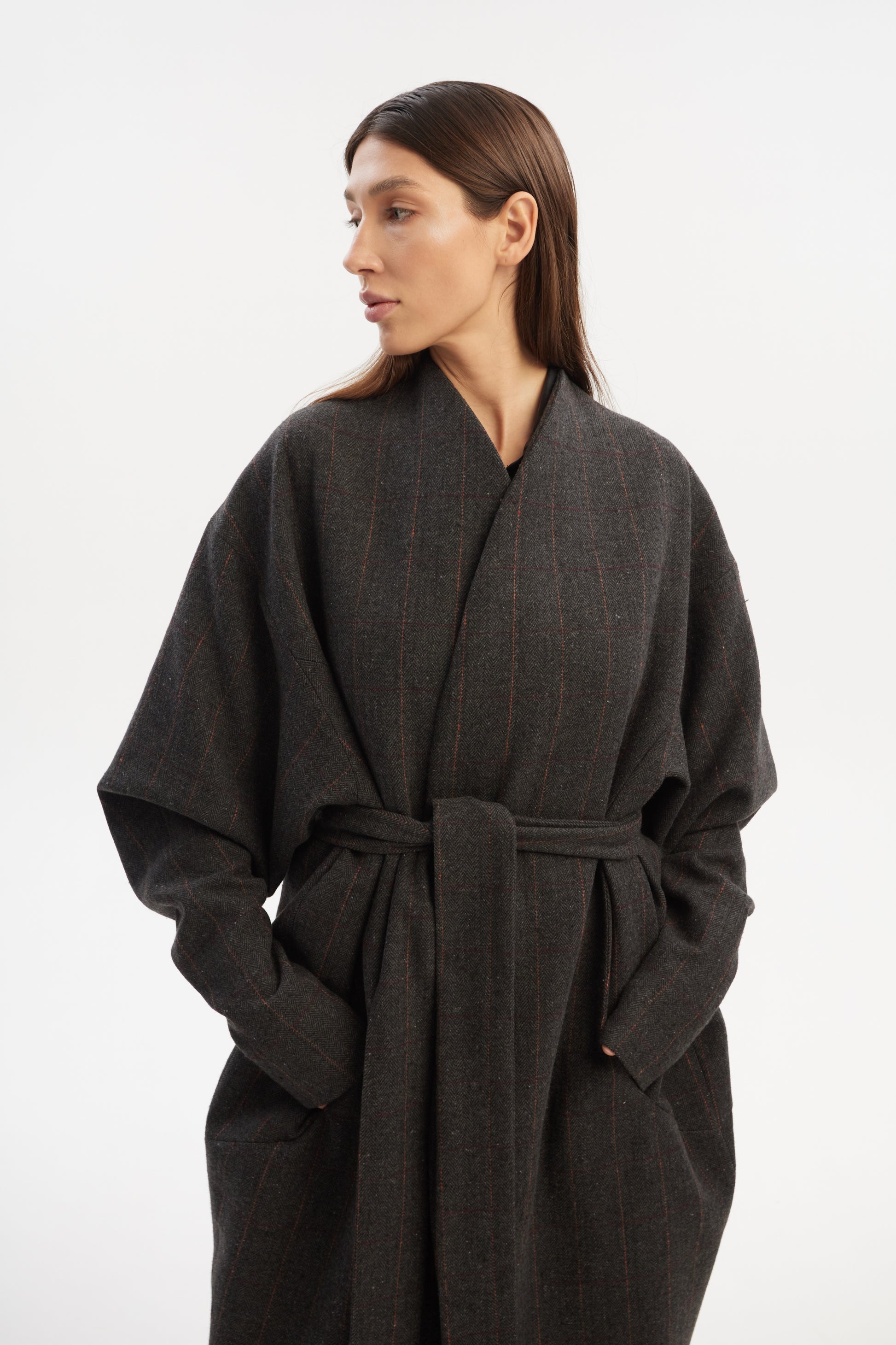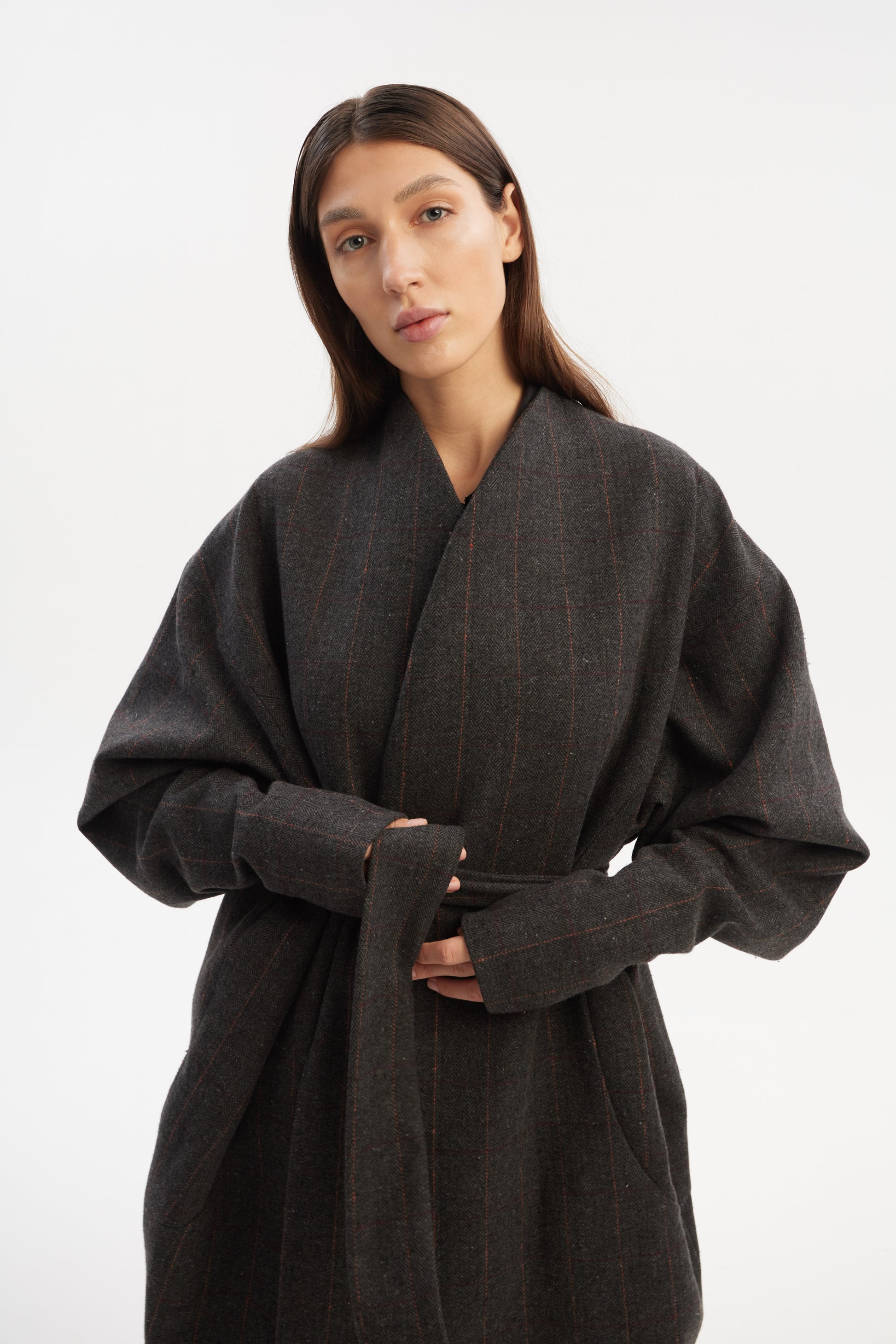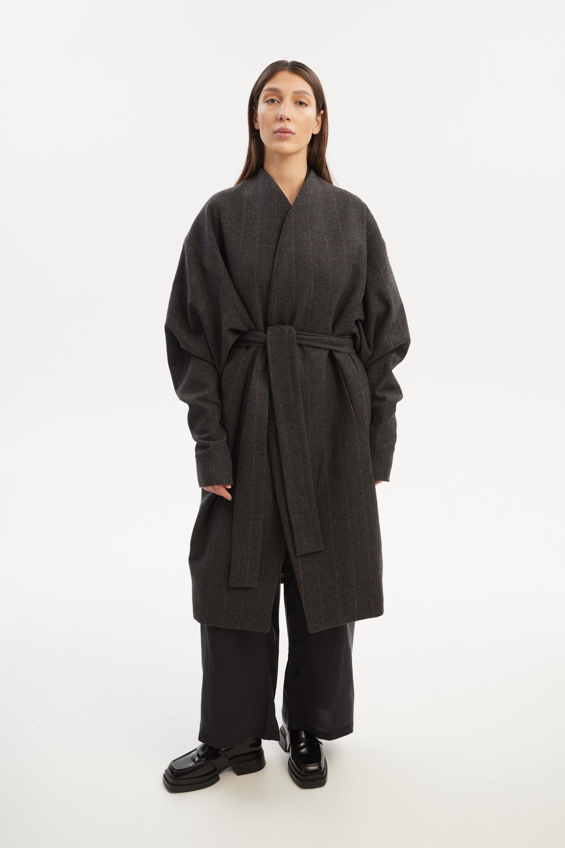 Signature Cocoon Wrap Coat with long tapered sleeves and zips on the wrists.